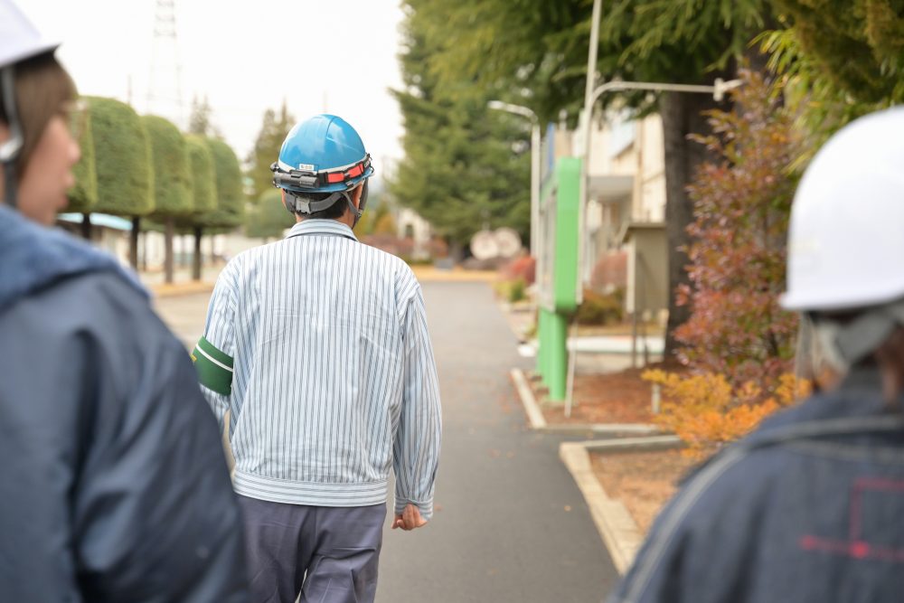 待ち合わせの時刻になると、水色のストライプの業務服に青いヘルメットという出で立ちで現れた宮澤さん。取材陣もヘルメット、ゴーグルなどを装着し、製造現場を見学させていただいた