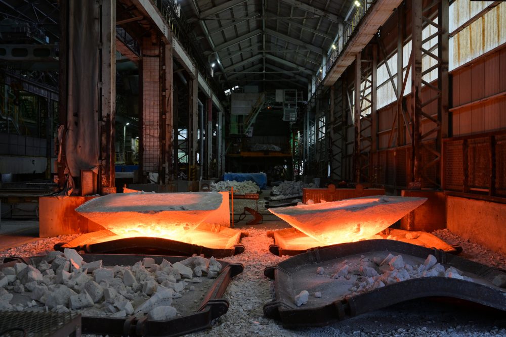 工場の建屋内では、その日の朝に炉から取り出されたという加工中の製品が並べられていた。赤みがかった色が、温度の高さを物語っている。