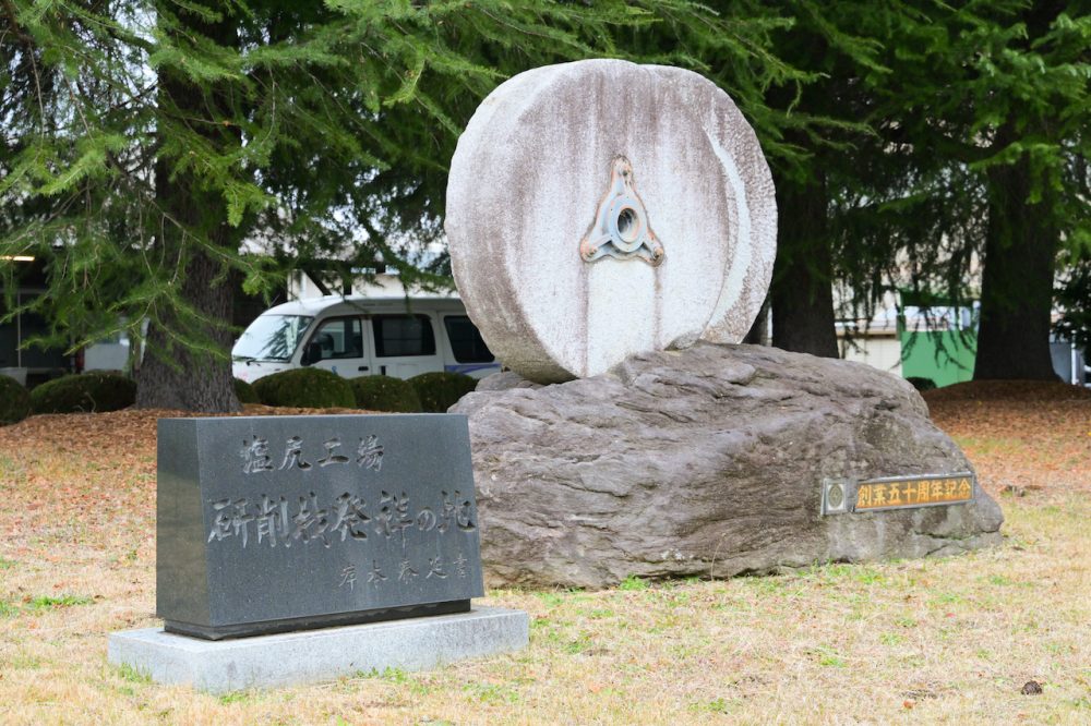 敷地内に残る「研削材発祥の地」と書かれた石碑は、会社のフロンティア精神を象徴している