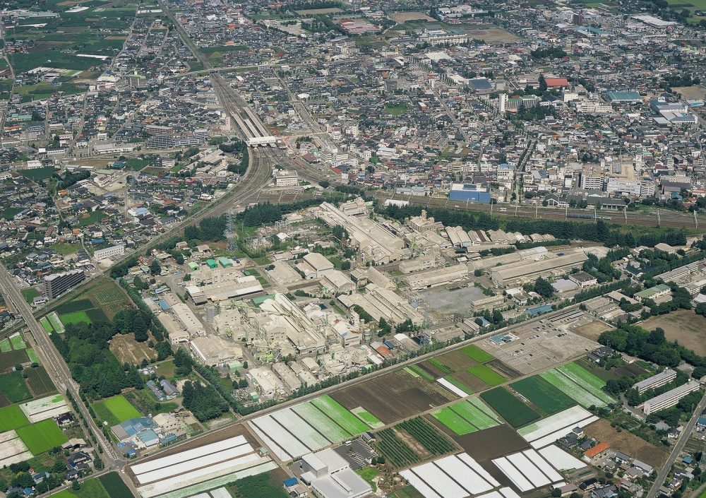 長野県塩尻市宗賀地区に佇む「レゾナック・セラミックス」の建物群(写真中央)。敷地内には、工場のほかに社員寮やレクリエーション施設なども完備している(写真提供:宮澤さん)