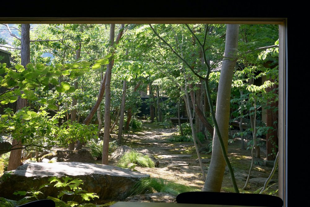 庭蒼の事務所の窓から。額縁のように庭が縁取られる。